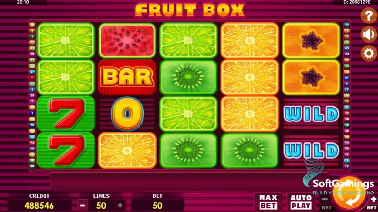 Fruitbox is a classic video slot – with 5 reels, 4 rows, and up to 50 paylines, you can expect a lot of fun here. Under the reels, you can make all the necessary adjustments. You can play with different numbers of paylines (10 to 50) and determine the bet size yourself. The minimum bet is 10 coins, and you can bet a maximum of 3,000 coins per spin. Once you have made all the settings, click on the large spin symbol in the lower right corner. The reels will start immediately, and the winnings (counting from left to right) will be automatically credited to your player account. An auto-play function is available and can be activated or deactivated at the click of a mouse. If you click on the question mark button, a detailed game guide will appear.